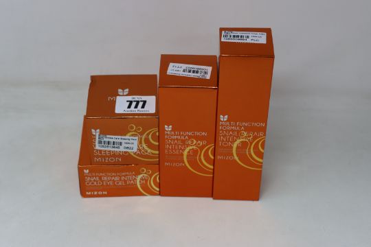Four Mizon beauty products to include Snail repair intense toner (4 x 100ml, EXP August 2021), Snail repair intensive essence (100ml, EXP August 2021), Snail wrinkle care sleeping pack (80ml) and Snail repair intensive gold eye (60pc).