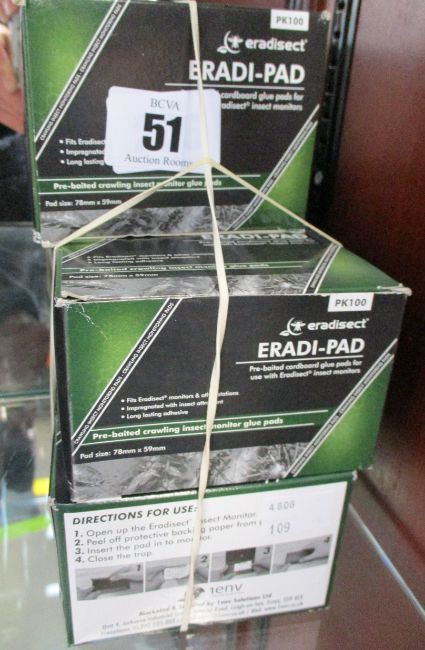 Five boxed Iradisect Eradi-Pad Pre-Baited crawling insect glue pads (100pc per box).