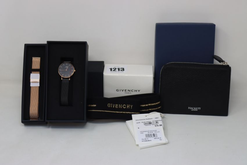 An as new Hackett London wallet together with a Givenchy hair band and an as new Daniel Wellington Classic Petite Ashfield watch with an additional strap.