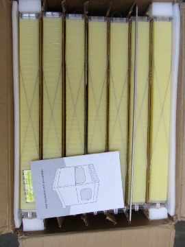 A boxed as new set of Golden Palace flow hive automatic honey flow frames to modify Langstroth boxes (Kit includes seven flow frames, one key and flow tubes).