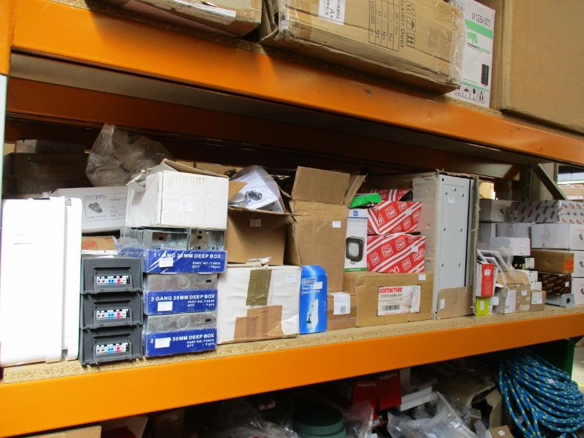 A large quantity of electrical equipment to include sockets/switches, fuse boxes and other related items.