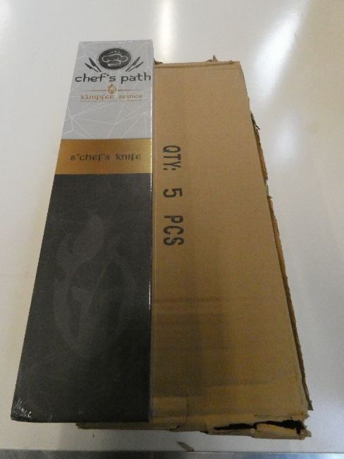 Five boxed as new Chef's Path Kampfer Series 8" Chef's Knives.