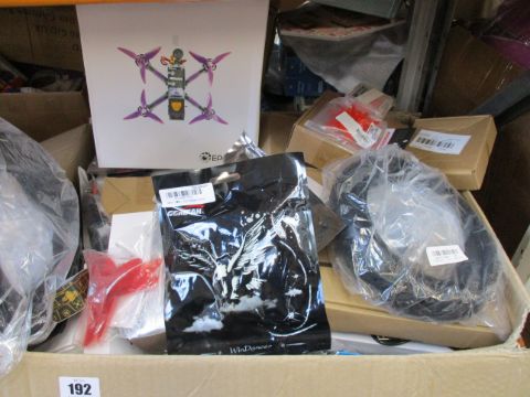 A box of assorted electrical items to include keyboards and mouse, drone, portable drive and wireless headphones.