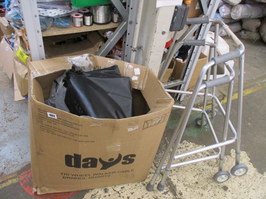 A collection of walking aids to include: one 3-wheeled rollator with cable brakes and basket and two wheeled aluminium walking frames.