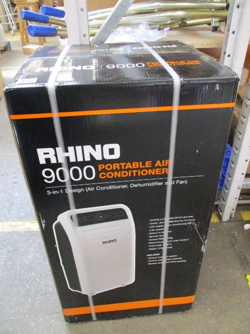 A boxed as new Rhino 9000 Portable air conditioner/dehumidifier in white.