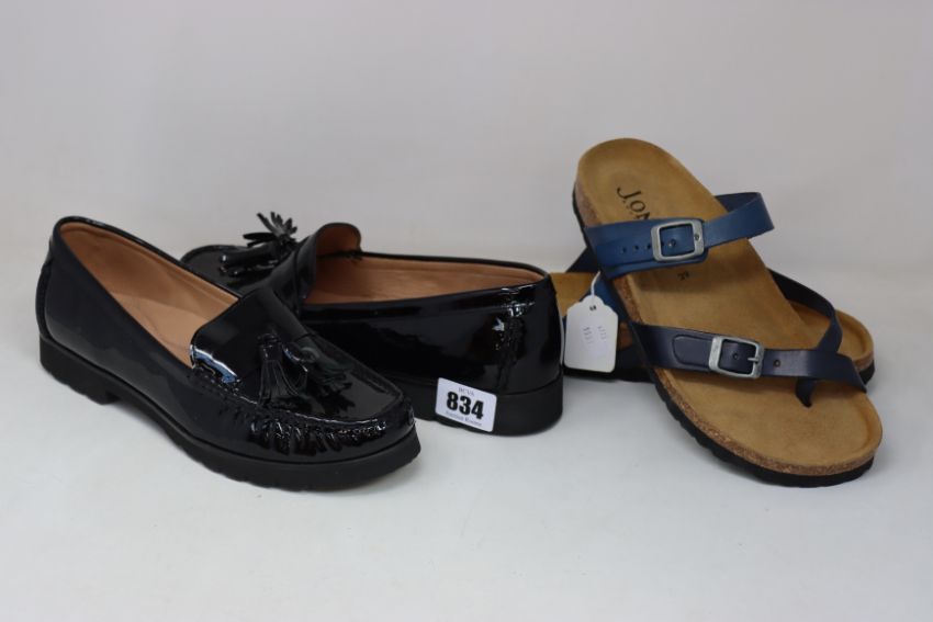 A pair of as new Jones Bootmaker Geranium black patent loafers (UK 9) and Jones Bootmaker Feix sandals (UK 6, no box).