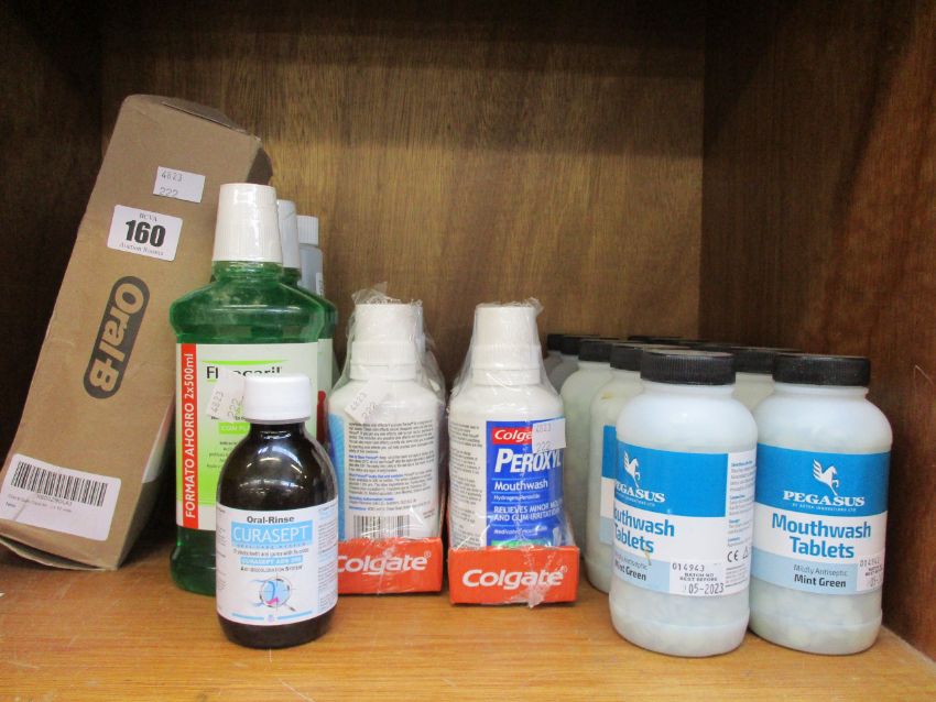 Ten Pegasus Mouthwash Tablets Mildly Antiseptic Mint Green (Approximately 1000 tablets each, BB: 05/23), along with other oral care products including eight Colgate Peroxyl Mouthwash (300ml).