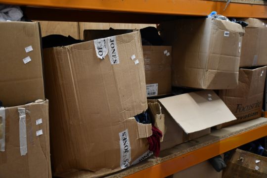 Eight boxes of assorted clothing and related items.