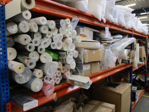 A large shelf of assorted household items to include blackout blind, wash basin, cot mattress, decorative wares and a large quantity of assorted wallpapers.