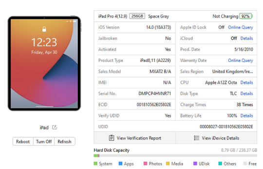 SOLD FOR PARTS: A pre-owned Apple iPad Pro 4 12.9" A2229 256GB in Space Grey (Activation lock clear) (Sold for parts only. Apple serial number lookup states 'This is a serial number for a product that has been replaced'. Some scratches to screen glass. Item sold as seen) (Checkmend report ID: : CM16946588-E48EC).
