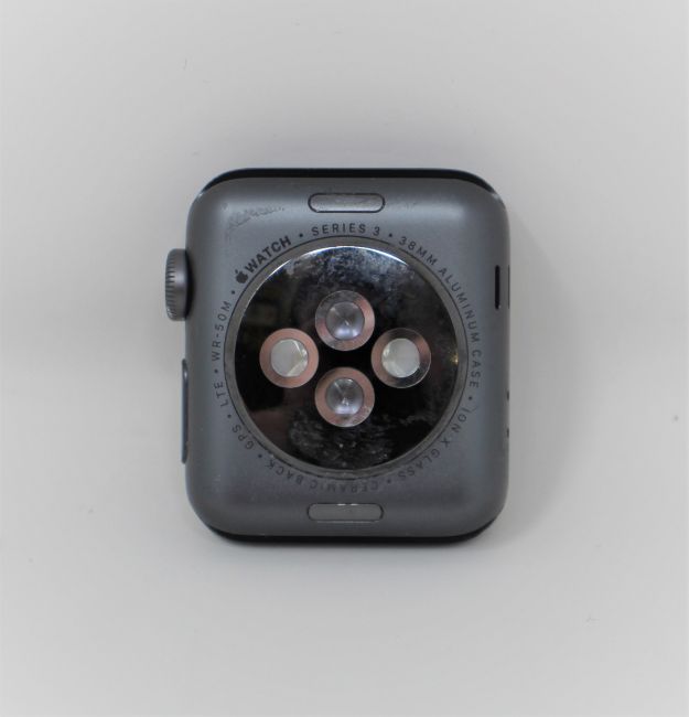 A pre-owned Apple Watch Series 3 Cellular Aluminum 38mm (3rd gen) in Space Grey (Serial: FHLVR3BBJ6GT IMEI: 359420081032309) (iCloud activation clear. Some scratches to screen glass) (No strap or other accessories included).