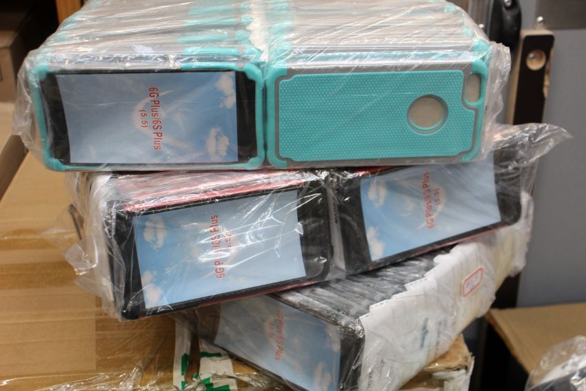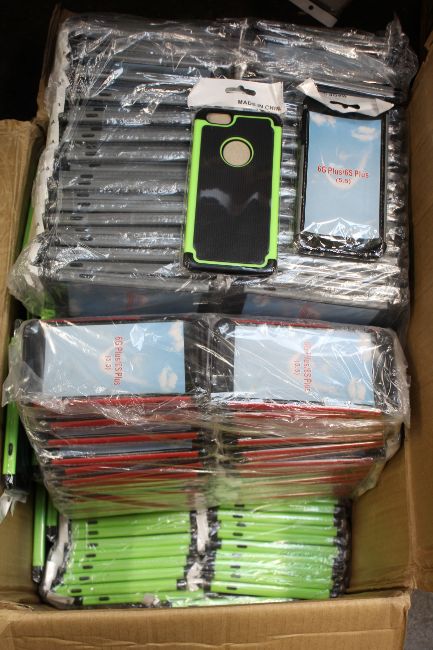 COLLECTION ONLY: A box of approximately three hundred as new phone cases for Apple iPhone 6 Plus/6S Plus in assorted colors; grey/black, green/black, red/black & blue/black. (Collection only, box weight 20.5KG).