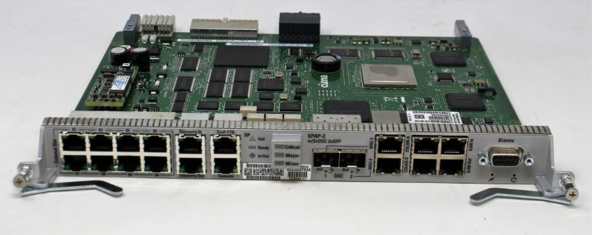 A pre-owned Ciena NTK555NA WOCUAZPKAA SPAP-2 w/2x0SC 2xSFP Shelf Processor (Untested, sold as seen).