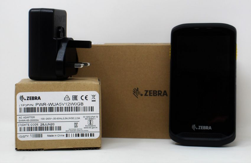 A boxed as new Zebra TC200J-10C112A6 Handheld Computer Barcode Scanner and a boxed as new Zebra PWR-WUA5V12W0GB Wall Charger (Cable not included).