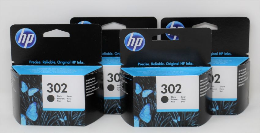Four boxed as new HP 302 Black Ink Cartridges (P/N: F6U66AE UUS) (EXP: May 2022).