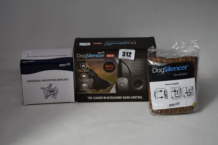 A boxed as new Goodlife Dog silencer max bark training device with boxed attachment bracket and tree bark design faceplate.