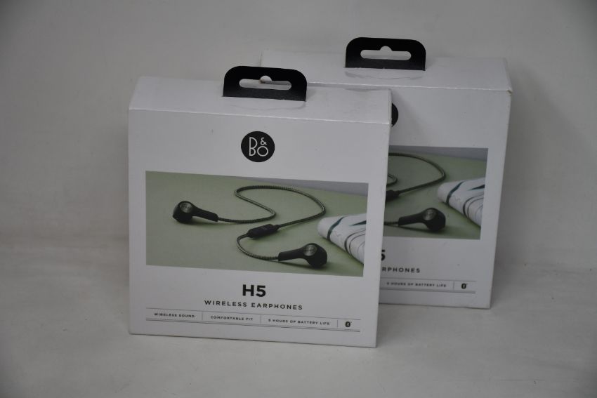 Two as new boxed and sealed Bang & Olsen moss green Beoplay H5 wireless earphones (SN31089925).