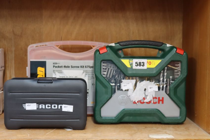 A Triton pocket hole 675 piece screw kit, a Bosch X70ti 70 piece mixed drill bit set and a Facom D163-J6 six piece socket set.