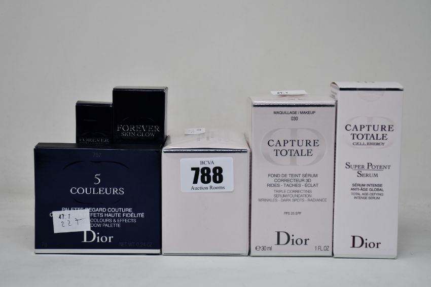 Dior cosmetic items to include Dior Capture Dream Skin moist and perfect cushion, a Dior Capture Totale super potent serum (11ml) and a Dior Forever Skin Glow foundation (30ml) (6 items).