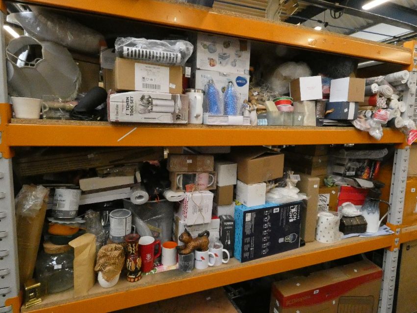 A large quantity of assorted household items to include wallpaper, ceramics, kitchen items, decorative and related items (Two shelves).