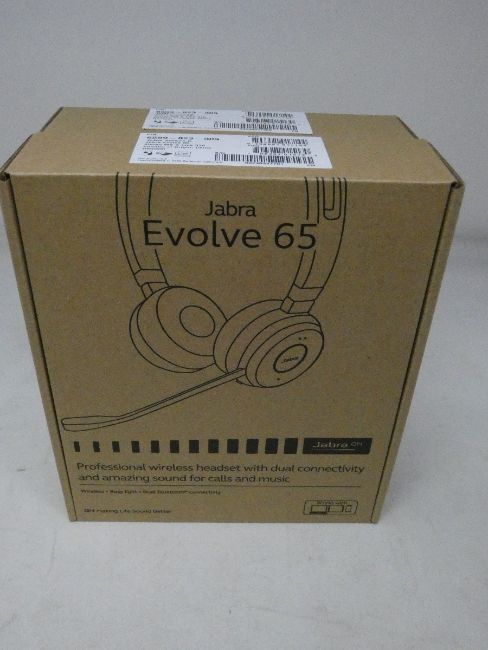 Two boxed as new Jabra Evolve 65 stereo on-ear Microsoft certified headsets.
