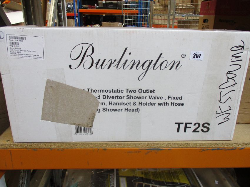 A boxed Burlington London TF2S shower arm, handset and holder with hose (Excluding shower head).