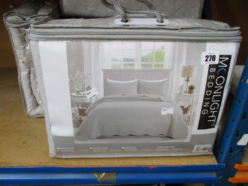 Two as new luxury weighted blankets with cover (60" x 80") and three as new Moonlight Bedding super king embossed silver bedspread.