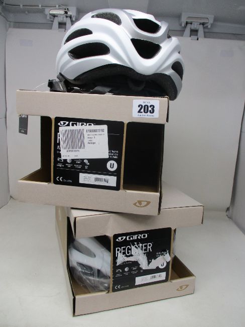 Two boxed as new Giro adult cycling helmets, matt white.