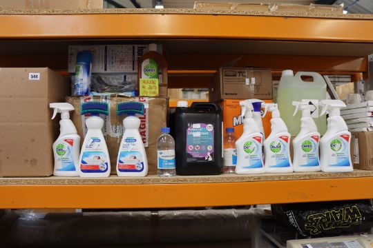 A quantity of miscellaneous cleaning related items to include Rubbermaid, Mr Muscle and Dettol.