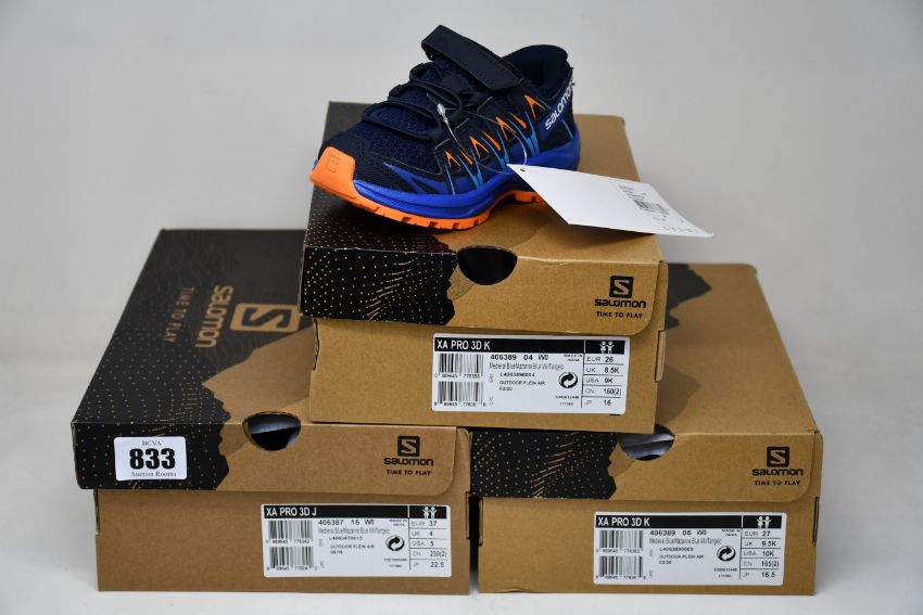 Three pairs of children's as new Salomon XA Pro 3D shoes (UK 8.5, 9.5k, 5).