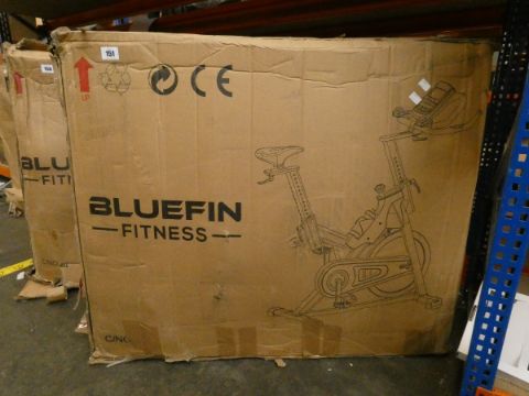 A boxed Bluefin Fitness Tour Spin exercise bike in silver (Item may be incomplete).