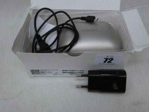 A boxed Phonak Marvel Charger Case Combi compatible with Marvel, Belong & Paradise Hearing Aids (Requires UK-USB adapter).