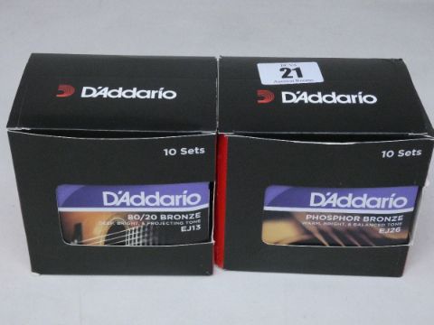 Twenty sets of as new D'Addario EJ13 80/20 Bronze Custom Light Gauge acoustic guitar strings.