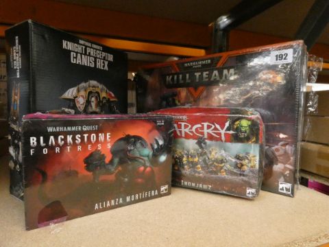 A boxed as new Warhammer 40,000 Kill Team starter set skirmish combat in the 41st Millennium (Some damage to outer seal and a slight knock to one corner), an as new boxed Knight Preceptor Canis Rex 2 Citadel miniatures (Imperial Knights), Blackstone fortress expansion pack Alianza Mortifera (Warhammer Quest Spanish Edition) and Warhammer War Cry iron Jaw figures (Damage to outer box).