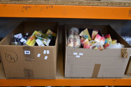 Two boxes of assorted as new beauty products and related items.