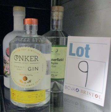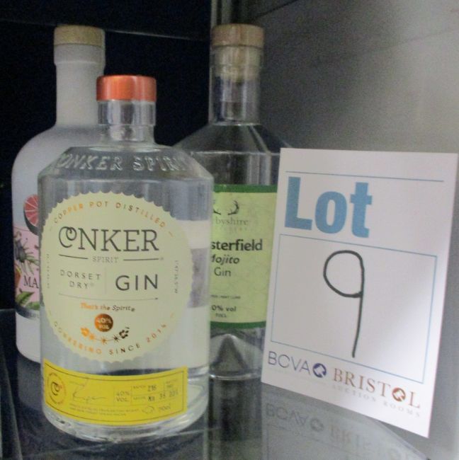 Three bottles of assorted gins, Derbyshire Distillery mojito gin (700ml), Conker Spirit Dorset dry gin (700ml) and Pink Marmalade colour changing gin (700ml) (Over 18s only).
