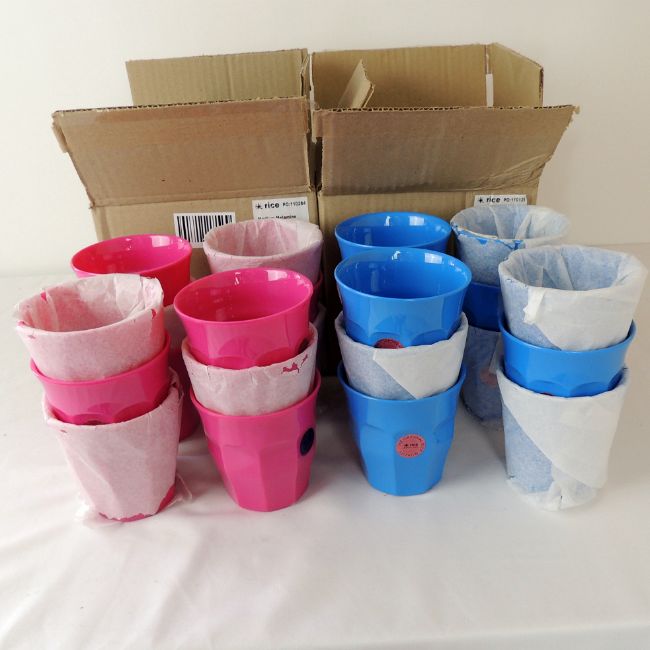 Twelve boxed as new Rice melamine cups in medium blue and twelve Rice melamine cups in fuschia