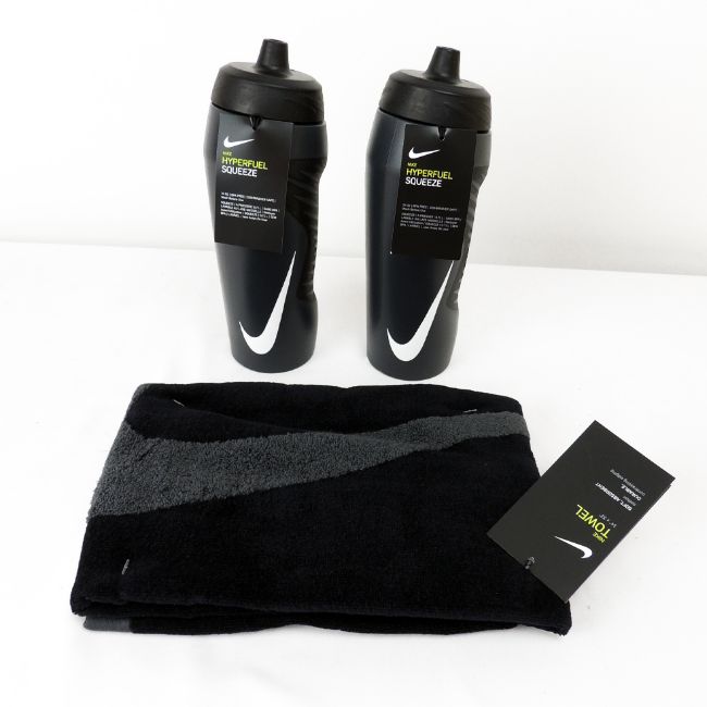 A bagged as new Nike Towel in Black and two Nike Hyperfuel squeeze 24oz in black
