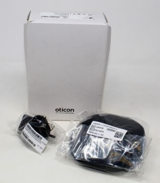 A boxed as new Oticon Charger 1.0 miniRITE R in Black for Oticon More, OPN & Ruby hearing aids (Box opened, UK plug included).