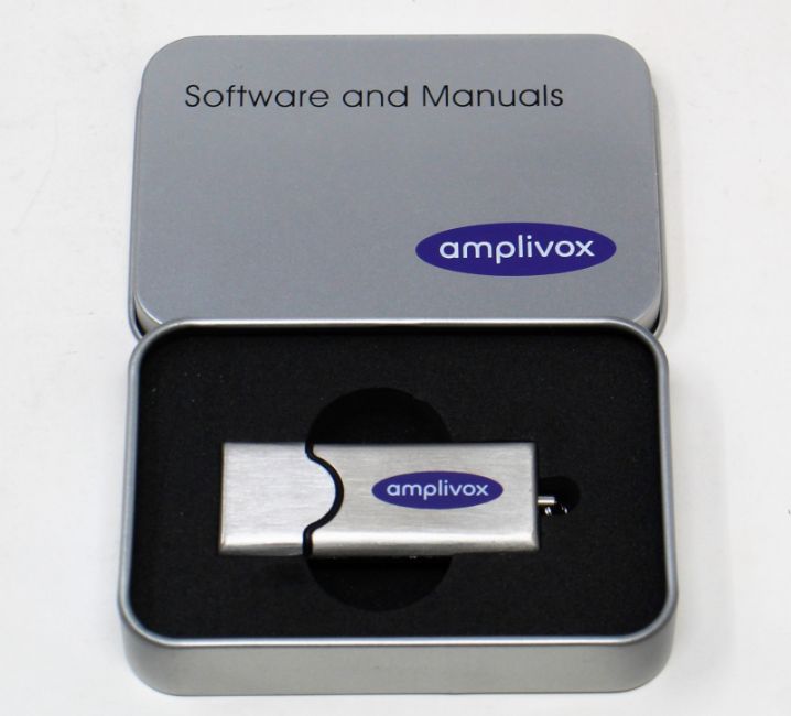 An as new Amplivox Audibase 5.5.101 Audiogram Database Software and Manuals USB Flash Drive in metal case (P/N: 8510705 Rev.5 OP/N: 8510706).