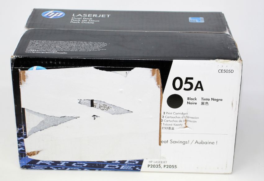 A boxed as new HP LaserJet 05A CE505D Black Toner Cartridge Dual Pack (Box sealed, damaged box).