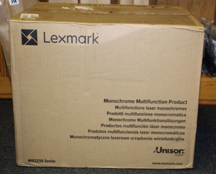 A boxed as new Lexmark MB2236adwe Multifunction A4 Mono Laser Printer (Box sealed, some damage to box).