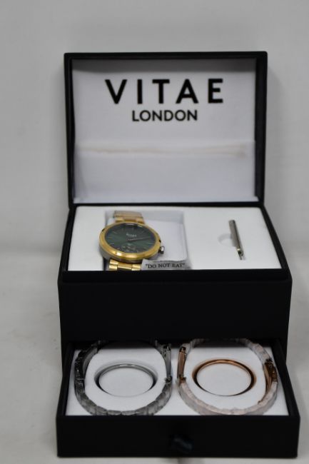 A boxed as new Vitae Elmington 36mm wrist watch (emerald green face). box includes additional changeable straps and surrounds in Gold/Rose Gold/Silver variants.