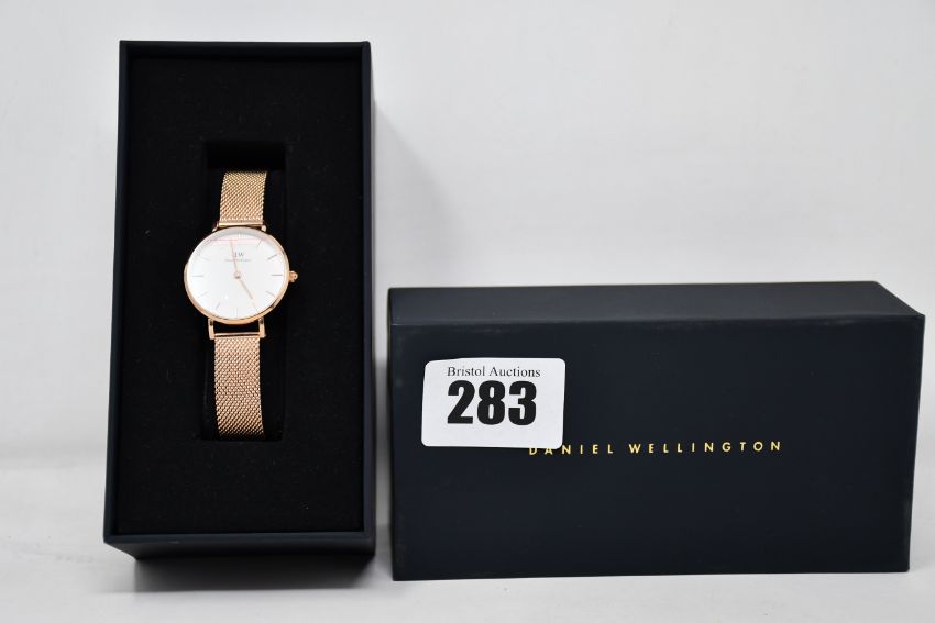 A boxed as new Daniel Wellington Petite Melrose, women's Rose Gold watch.