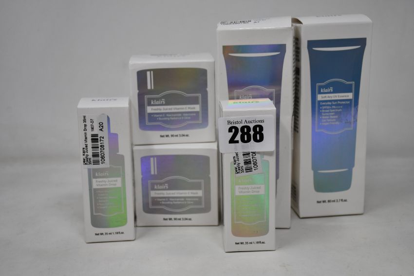 Two as new Klairs Soft Airy UV essence (2 x 80ml), two Klairs freshly juiced vitamin drops (2 x 35ml) and two Klairs freshly juiced Vitamin E masks (2 x 90ml).