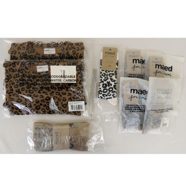 Assorted Bagged as new Maed For Mini childrens clothing to include two bagged as new Maed For Mini chocolate leopard body 1y, a bagged as new Maed For Mini white leopard knee socks 1-2y, a bagged as new Maed For Mini brown leopard AOP tights 1-2y, Three bagged as new Maed For Mini brown leopard knee socks 1-2y and a bagged as new Maed For Mini brown leopard knee socks 1-2y