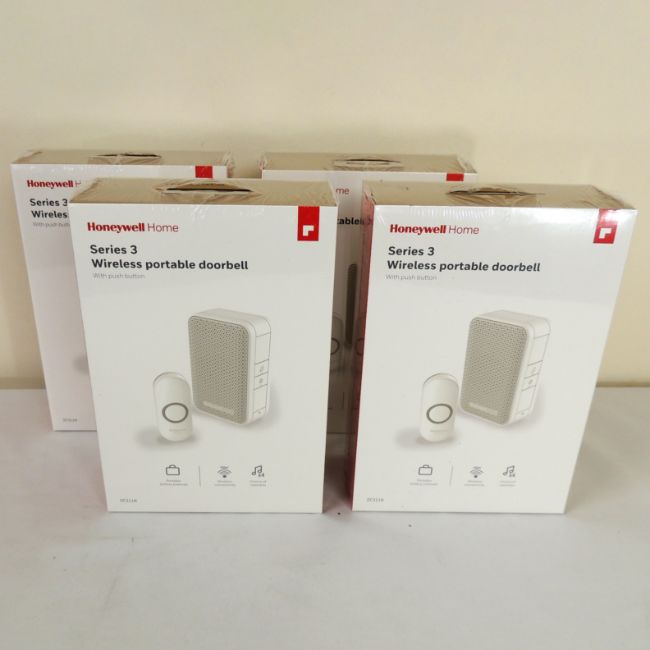 Four boxed as new Honeywell 150m Wireless Portable Door Chime Kit 4 Tunes in White. RRP £42 each