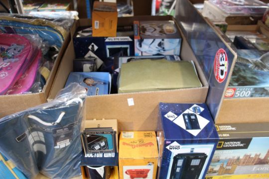 Assorted as new British film/TV novelties to include mugs, bags, puzzles and toys from franchises such as Mr Bean, Star Wars, Wallace and Gromit, Doctor Who and Thunderbirds.