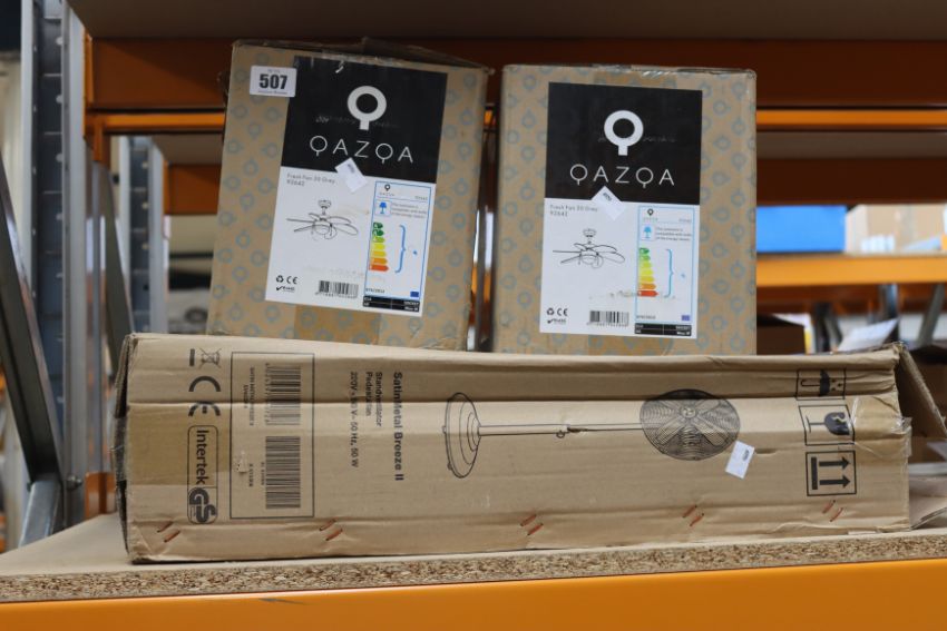 Two boxed Qazqa fresh ceiling fans in grey and a Casa Fan satin metal breeze 2 pedestal fan.