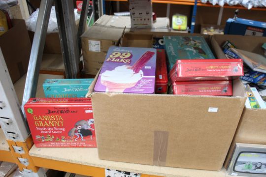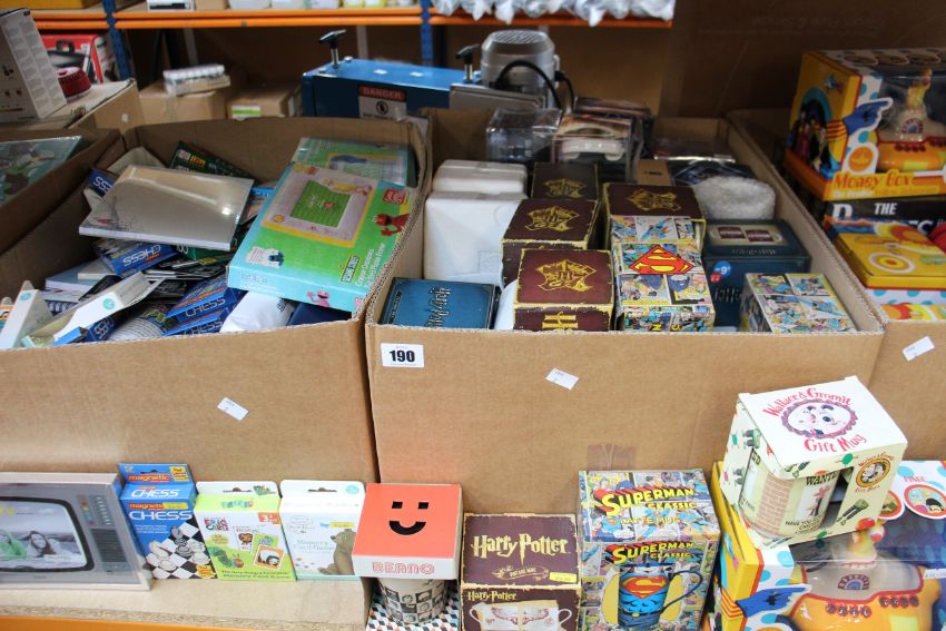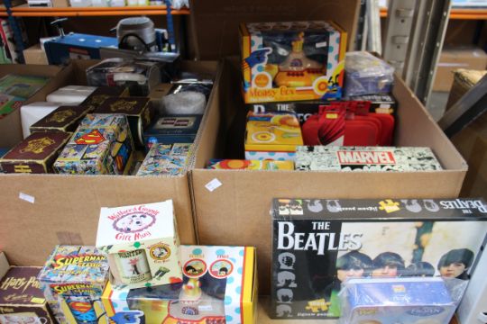 Assorted as new British film/TV novelties to include mugs, money boxes, bags and toys from franchises such as Sesame Street, Doctor Who, Wallace and Gromit and The Beetles.